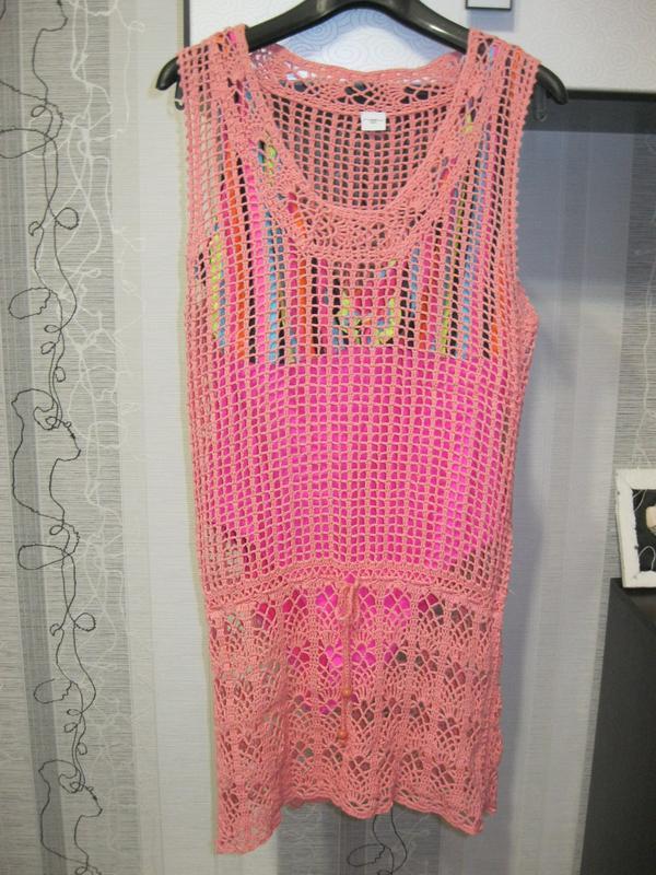 Коралловая вязаная крючком пляжная туника с ажурными принтами для наглядности под парео поддет купальник аналогичного размера (тоже продается) длина 89 пог=поб=максимально 61. благодяря вязаной структуре изделие прекрасно тянется, хоть на фото и выглядит аленьким. Состав: 100 коттон есть на фото