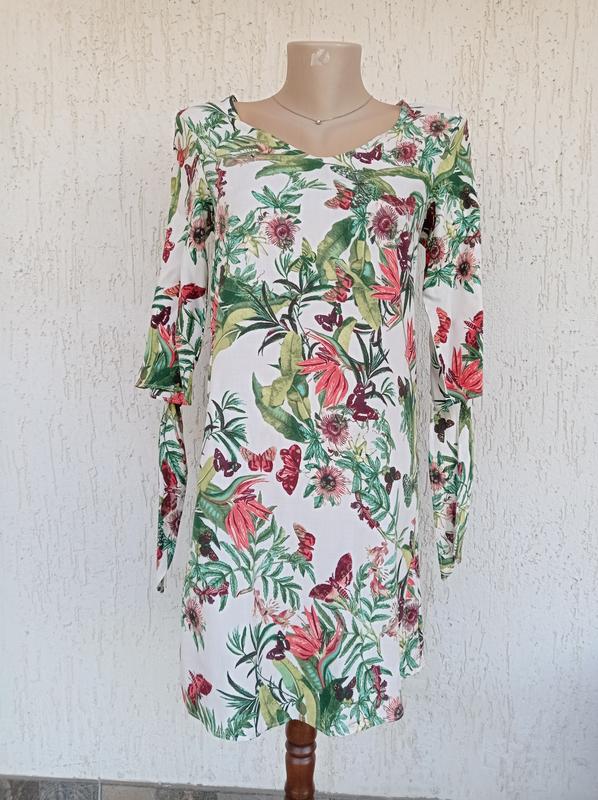 Чудова туніка вільного крою, з квітковим принтом, 💯% віскоза, легка, яскрава, комфортна. Розмір вказано xs, орієнтуйтеся по замірах: довжина 82, рукав 3/4, ПОГ 44. Стан відмінний, можна як платтячко носити.