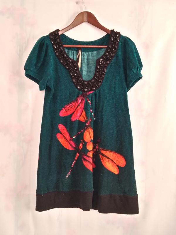 Платье -туника свободного кроя. Состояние отличное. Длина 78см, полуобхват груди 49см, полуобхват бёдер 53см, по плечам 34см. Состав не указан, ткань не много тянется, напоминает трикотаж. Остались вопросы пишите-отвечу . Оплата на карту.