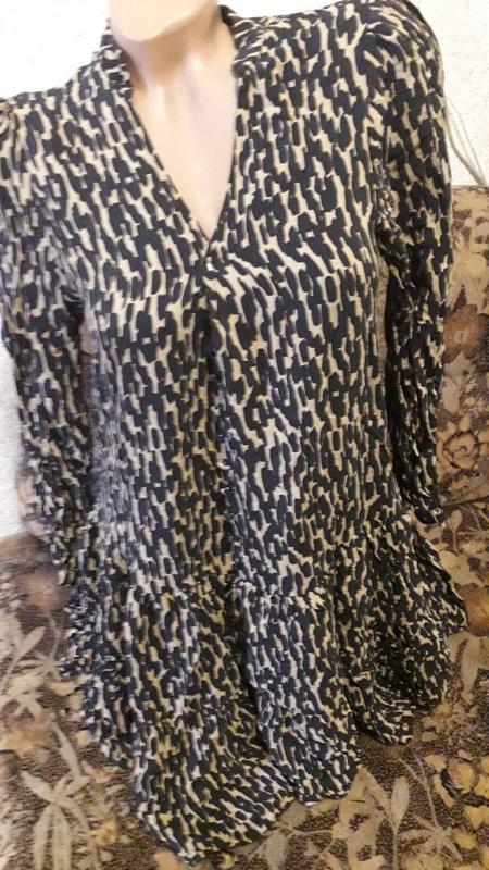 длина по спинке 86 см пог 46- 47 см без натяжки поб 54 см над оборкой дальше произвольно рукав 53 см плечи 34 см , до оборки 56 см оборка 30 см , от декольте пуговицы- иммитация застежки.Рукав застегивается на пуговицу.