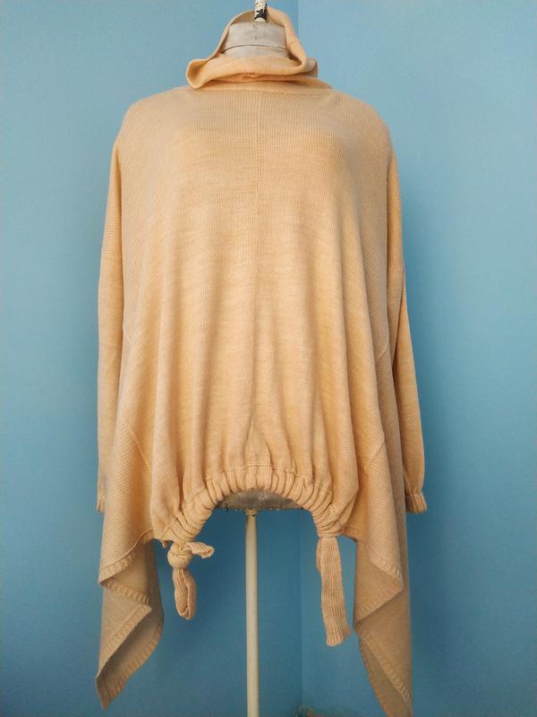 Туника овер-сайз бледно персикового цвета. Состав пряжи не помню, но смесовка с шерстью и альпакой, несмотря на габариты , вещь очень лёгкая. На фото надета на манекен огромного размера, я носила на s-m. Длина по спинке 68, ширина по от плеча до плеча- 84 (плечо спущенное), длина рукава- 43. Есть минимальные следы носки и небольшие нюансы( в основном с изнанки)