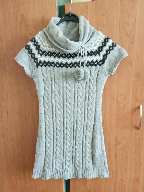 Женская тёплая вязаная туника saps серое платье с помпонами в этно стиле короткий рукав зи...