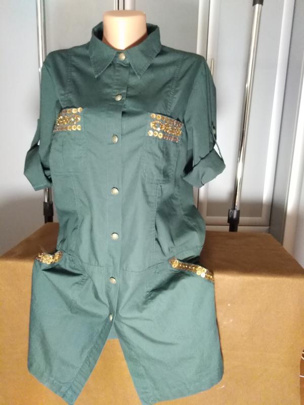 Хлопковая темно-зеленая туника, карманы украшеы пайетками, длина рукава регулируется. Размер 48-50. ПОГ-52 см, длина от плеча -90 см.
