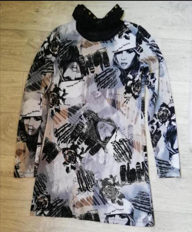 Туника с красивым кружевом на шее, сзади фиксируется заклепками (см. фото) Состояние очень хорошее Ткань приятная к телу, весна-осень подойдёт Бирка срезана, размер S, M Длина 80 Талия 37.5 Рукав 61