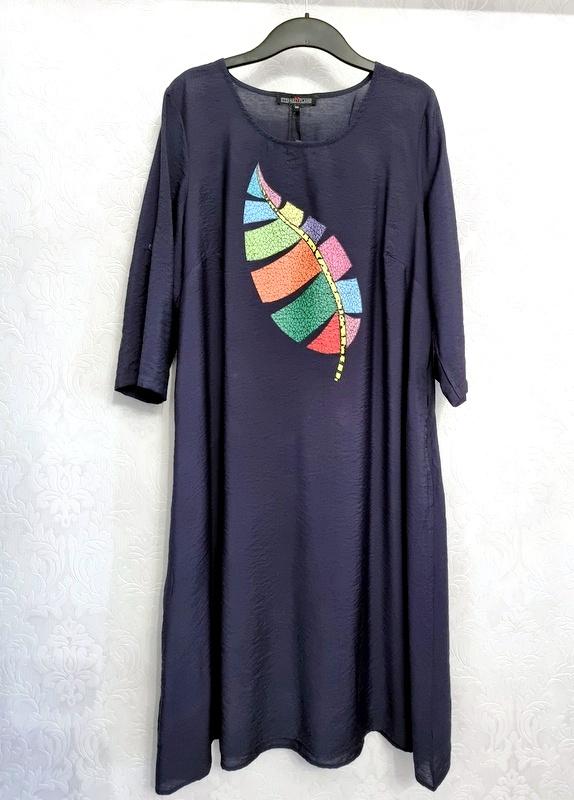 Легка сукня туніка у стилі Бохо від іспанського бренду Eternal Flame. Модель вільного крою, з кишенями. Рукав 3/4, можна зробити короткий застібнувши на хлястик і гудзик. Колір однотонний, темно-синій. На грудях яскравий принт. Довжина міді, нижче за коліно. Склад - 80% бавовни, 20% шовку. На дотик приємна тканина шовковиста, і добре пропускає повітря. Прекрасно на кожен день та у відпустку. Розмір 54 - довжина 113 см, ПОГ 60 см, ПОТ 62 см, ПОБ 68 см, плече 10 см, рукав довжина 47 см, обхват руки 38 см, по плечах ширина 42 см. Стиль - бохо/повсякденний. Як нова. Купили, але не підійшла за розміром ..