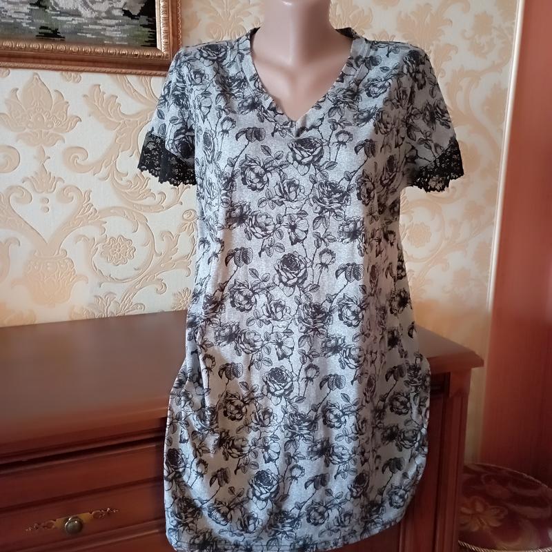 Дуже приємний трикотаж можна, як домашнє платтячко або нічна сорочка ширина по плечах 40 між проймами 54 по талії 50 по бедрах 56 довжина рукава 20 довжина по спинці 81