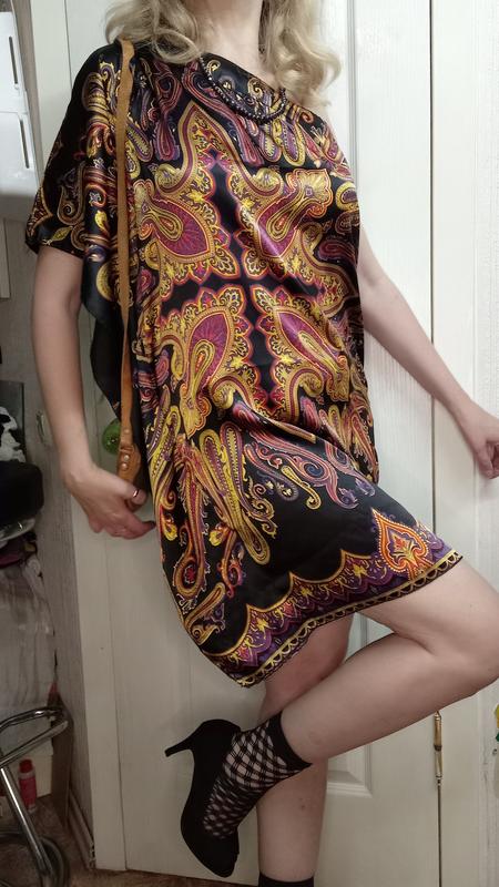📌необыкновенное, яркое платье туника. 📌 эксклюзив! на одно плечо размер 8, 3436 наш 40 грудь 51 бёдра 50 см модный восточный принт " турецкие огурцы" ткань, тонкая шелковистая стопроцентный полиэстер присутствует золотисто-жёлтый красный фиолетовый и чёрные цвета можно одевать с поясом и без. а также можно одевать ,как на одно плечо,так и на другое.