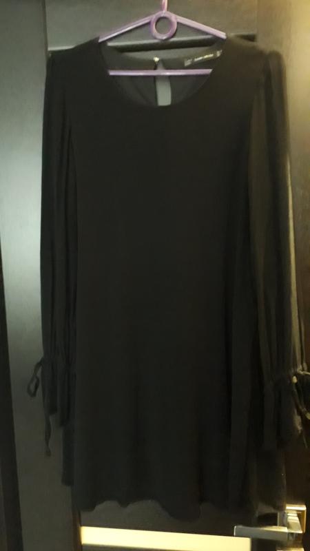 Маленькое черное платье.Жежное платье, свободного кроя на подкладке с завязками на рукавах.С зади застегивается на пуговичку.Длина платья 84 см, длина рукава 66 см.100% вискоза.