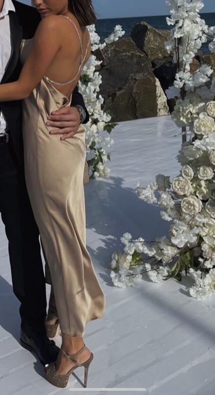 Вечернее платье одето было один раз, индивидуальный пошив, камни Сваровски сзади, ткань атласная , цвет бежевый, замеры :89-63-90