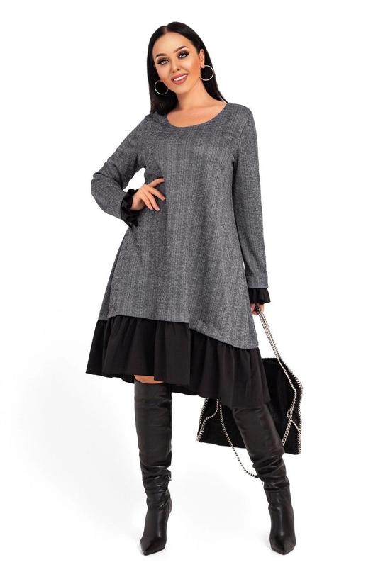 Розмір : 46-48; 50-52; 54-56; 58-60 Тканина : трикотаж ангора софт ГАРНА РОЗТЯЖНІСТЬ Довжина сукні : 105 см . Довжина рукава : 63 см. Стильна , практична , сучасна сукня , з приємної тканини - ангора софт , має розтяжність . Сукня просторого покрою -трапеція , в низу з воланом , рукав з манжетом .