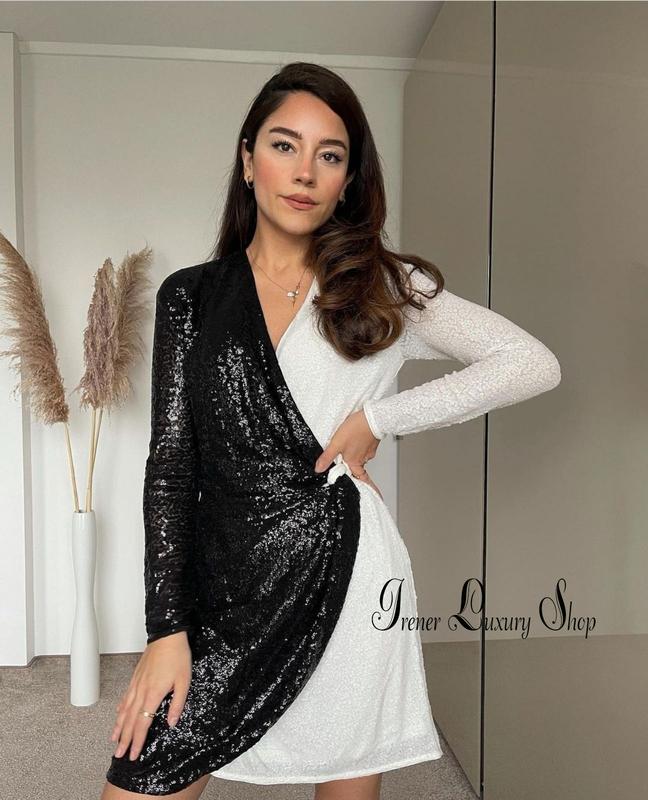 Изумительное платье от H&M из новой коллекции ! Платье контрастное как День и Ночь , Инь и Янь . Прямой крой с пришитым запахом спереди. V-образный вырез , на талии резиночка сбоку декоративно схватывается шлевкой. Внутри к телу трикотажная подкладка. Размер у меня М , но по отзывам большемерит на размер отлично сядет и на 46-48 Длина 93 см , рукав 55 см , под мышками 52 пот 40 тянется до 55 см ,поб 51 тянется до 60 см Цена у меня 1000 грн вместо 2000 оригинальной РАСПРОДАЖА 800 грн Подписывайся и смотри, собрала уникальную коллекцию платьев самых лучших брендов со всей Европы и США , у меня есть чем удивлять и восхищать . Вдохновляйся со мной ! Оплата на карту Привата/Монобанка Новая почта Ежедневно! Укрпочтой по желанию ! Возврата и обмена нет! Резерв держу 1 сутки. Есть наложенный платеж новой почтой по предоплате!