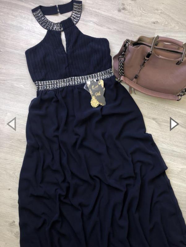 Дуже шикарна вечірня сукня. Бренд Eve Seduire Gold Collection. Розмір указан14 ( 48) ( Підійде на 46,48,50) ДИВІТЬСЯ ЗАМІРИ !!! Дуже красивий темно-синій колір. Сукня з чокером - який застібається ззаду на два гудзики. Чокер і зона пояса прикрашені сріблястими паєтками та бісером. На грудях від чокера до декольте є виріз. (на фото) Талія йде трохи завищена. Спереду на грудях тканина йде - пліссе (у складки) А ззаду спинка резинка яка дуже добре тягнеться (на фото видно) Низ сукні шифон - шифону дуже багато! на підкладі Сукня дуже шикарно виглядає. Дуже гарний темно-синій колір. Сукня виглядає дуже ніжно та дорого. ЗАМІРИ ; -довжина від пахв - 129 см - Довжина від чокера до низу - 141 см -Довжина від чокера до верхнього шва пояса -28см -ширина самого пояса – 4.5 см -Довжина від пояса до низу - 108,5 см - Ширина під руками (у трохи розтягнутому вигляді - 49см (повністю - 98см). Можна і на менші груди. А можна і на трохи більші. У грудях тягнеться за рахунок гумки на спинці. - Ширина в поясі в нерозтягнутому вигляді - 37см см, (повністю 74), Пояс теж добре тягнеться за рахунок гумки на спинці.