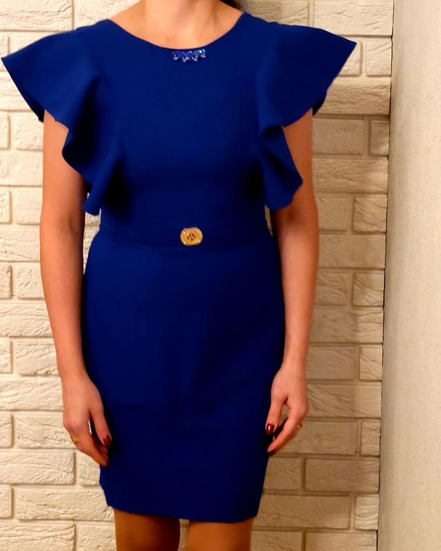 Вечернее платье, очень красивого цвета электрик. На рукавах объемные воланы. На спине замок. ширина в талии 37 см. длина 85 см.