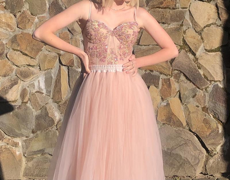 Выпускное платье: фатиновая юбка и вышитый корсет на завязку, пудрового розового цвета, тугость стяжки корсета подбираете самостоятельно для комфорта. Корсет и юбка являются раздельными, для того, чтобы корсет можно было одеть до костюма, как и юбку к любому другому, но вместе носится как платье. Корсет можно заправлять в юбку, а можно вытаскивать на нее по желанию. Бретельки в корсете регулируются и снимаются по желанию. Внутри вставлены чашки и косточки, каркас из полупрозрачного материала. Юбка на резинке, поэтому не будет спадать при любом размере талии в пределах XS-S. Длина юбки - меди (нижняя за колено). Тип - полусолнце, красиво крутится, но не поднимается. Платье является новым, одето только раз, пошито исключительно с целями абсолютной свободы, ведь позволяет по-разному себя стилизовать отдельно используя корсет и юбку для других образов. Выполнена из натуральных материалов, корсет вышит вручную. Возможен торг.
