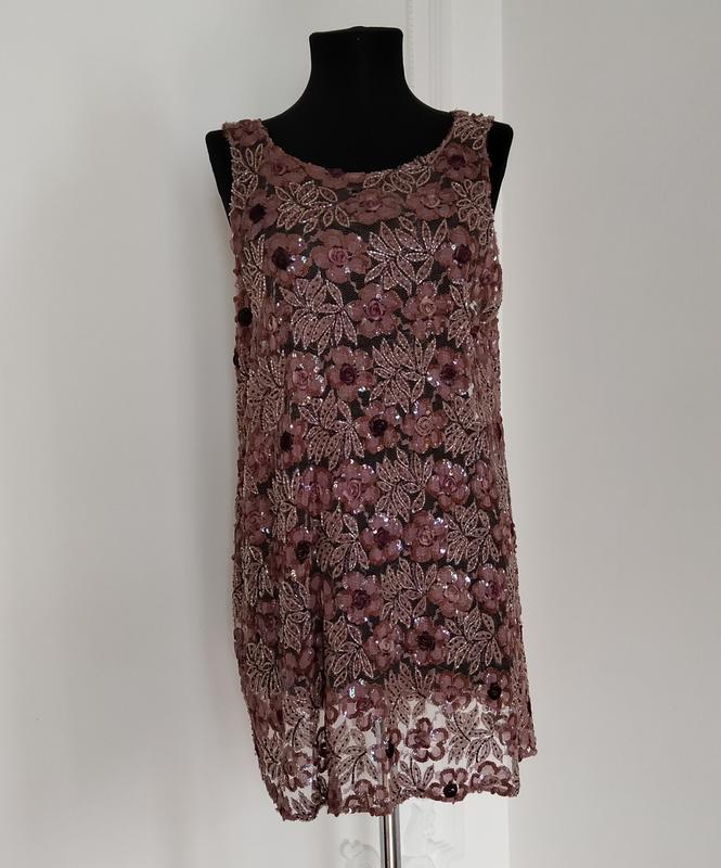 Очень красивое, нарядное платье. Гипюр вышит бисером, пайетками, лентами. Прозрачная, под низ надевала обычное бежевое базовое платье. Параметры - обхват груди и талии - 110 см. Длина платья - 76 см.