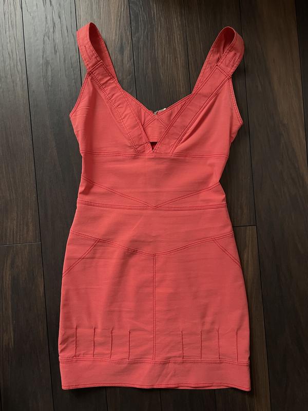 Ефектна міні сукня морквяного кольору. Має цікавий виріз на грудях. Ідеально підкреслює жіночі форми 😍 Довжина від плеча до низу -81 см Стан: ідеальний