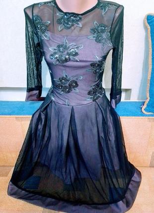 Нарядное платье на хуженькую девушку или на подростка. Размер 40-44. В состоянии нового. Прозрачная мягкая ткань сетка, хорошо тянется, под низом подкладка плотная мягкая, сиреневого цвета. Перед расшит бисером и пайетками. ПОГ 40 см, тянется до 45 см, ПОТ 35 см, длина рукава 46 см, 3\4, длина 98 см. Доставка: 100% предоплата на карту Приват банка или через Шафу. Способ доставки УП оплата доставки при получении, Новая почта,
