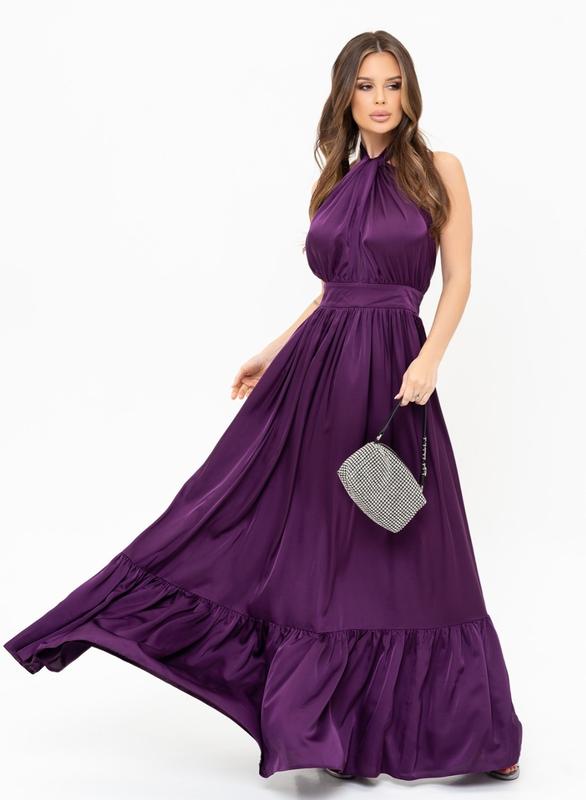 Длинное платье из шелка с приталенным кроем и открытой спиной. Модель с широкими завязками-трансформерами, которые образуют вырез на груди. Платье оснащено молнией сзади на талии и декорировано нижним воланом. Размер: S, M, L. Замеры на фото. Цвета: фиотетовый, оливковый, горчичный. Материал: Шелк Состав: 80% шелк, 20% полиэстр 13925