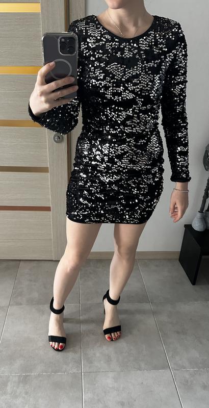 Платье вечернее в пайетки, прекрасно тянется держит фигуру. Одягалась один раз.