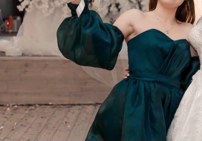Вечернее платье, шить под заказ, цвет зумрудного, к платью идут рукава которые снимаются. Платье в корсетном стиле. Кому недостаточно фотографий, есть видео, и по более детальной информации, обратитесь за номером телефона ********** Евелина (Вайбер/телеграм) Полу Объем груди - 41 Полу обхват талии - 35 Длина - 70 Цена 3500 является торг