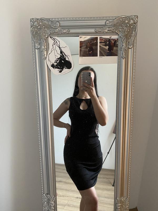 Платье черное с каплевидным вырезом и кружкой по боках и на спине, черного цвета, размер М, одето на S. Без дефектов