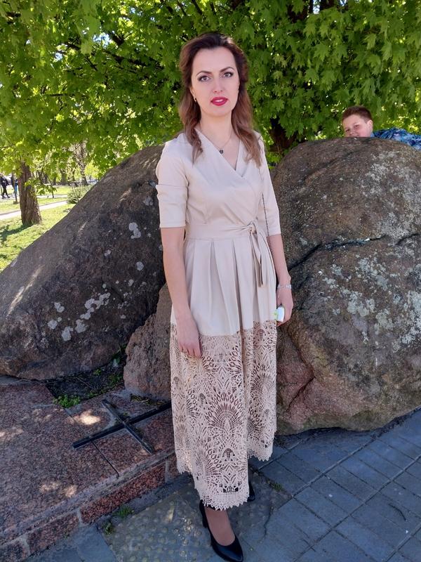 Нежное, элегантное, изящное женское платье. Верх- искусственная кожа, низ - качественные кружевы, есть подкладка. На бирке указан р42, но подойдет на 44 - 46. Ориентируйтесь по замерам. Замеры: длина-138см (по спинке), ПОГ - 47см ( может подойти и на более крупную грудь, ведь пошив на запах), ПОТ - 39см. Одетая 1 раз. Никаких нюансов. Цена 1100грн, приобретала значительно дороже.