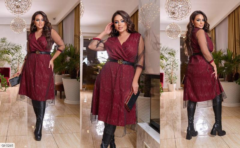 со19.09 Коктейльное платье GI-5265 1296 Размиры: 58-60, 62-64 Цвет: зеленый, бордо, беж, черный. Ткань про-во Турции: прочная, сетка с люрексовой нитью. Элегантное женское платье, выполненное из прочного трикотажа (тянется) и сетки с блеском. Перед платья с имитацией запаха. К платью прилагается съемный пояс из основной ткани. В таком платье любая женщина сможет почувствовать себя настоящей леди и королевой вечера, это платье способно придать женщине нежность, легкость и элегантность. Замер: Размер 50-52: Сукня: дл. Изд. 112 см, рукав 47 см. Ог-110 см, от-90 см. Размер 54-56: Сукня : дл. Изд. 114 см , рукав 47 см. Ог-120 см, от - 100 см. Размер 58-60: Сукня : дл. Вид 116 см, рукав 47 см. Ог-128 см, от - 110 см. Размер 62-64: Сукня : дл. Вид 116 см, рукав 47 см. Ог-134 см, от - 120 см.