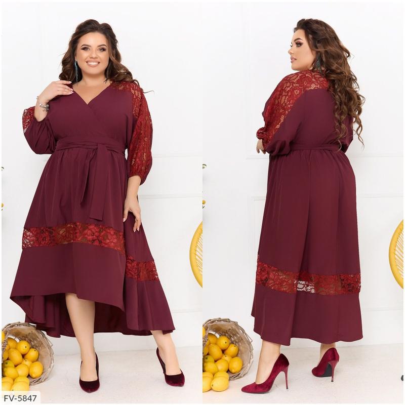 соПлатье FV-5840 Код 3301 Размиры: 48-50, 52-54, 56-58, 60-62 Ткань: софт+гипюр. Цвета: Марсала Черный Бутылочный Красный Т. Синий Ярко синий Длина: 119/135 , 120/136, 121/137, 122/138 см. Длина рукава от горловины: 57, 58, 59, 60 см. Обхват рукава 48, 49, 51, 52 см. Замеры готового изделия: 48-50 ог 100 от 84 об 184 52-54 ог 108 от 92 об 192 56-58 ог 116 от 100 об 200 60-62 ог 124 от 108 об 200 Невероятно красивое женственное платье со вставками гипюра. Верх платья с эффектом запаха, по талии собрано на резинку. Низ асимметричный - спереди короче, сзади длиннее. Рукав 3/4, цельнокроеный, собран на резинку. В комплекте пояс из основной ткани.