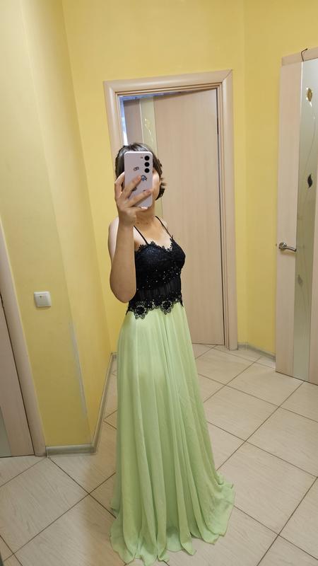 Вечернее платье в идеальном состоянии. Камера не слишком передает цвет.Дыть на последнем фото. Подкладка желтого цвета, шифон салатавого,разом дурманящий цвет. На платье пишет что 38 размер, а маломерит,на 36.Корсет черного цвета в камнях с прозрачной сеткой.Все виден на фото. Длина всего платья - 134 см, от начала юбки - 113.
