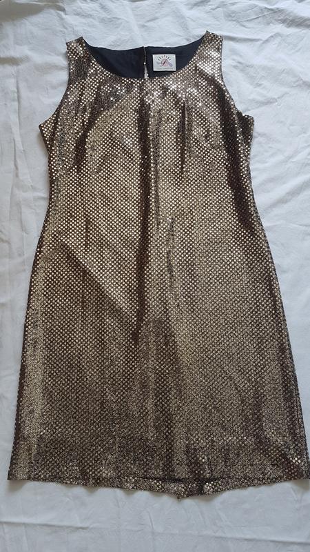 Классное платье, золотистого цвета. Размер М, но под пояс можно и на С. Жодного разу не одягалась. Так и не добивалась своего времени.