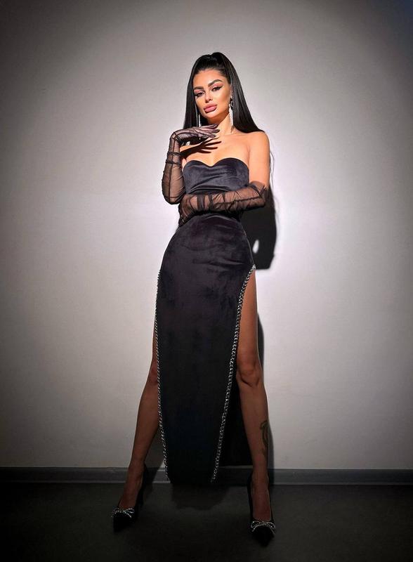 Изысканное длинное бархатное платье с разрезами декорированное цепочками с перчатками, веч...