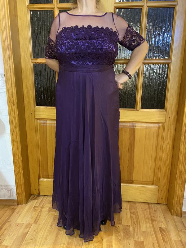 Красивое длинное вечернее платье фиолетового цвета, с этикеткой, не было в использовании. Ефектна. Верх прозрачный, лиф кружево, юбка прозрачный шифон, подкладка атлас. Платье имеет « чашечки». Размер 16. Я примерила на 18, но мне мала, на спинке открытая молния. Снеслась, чтобы выглядели. Папрбхват груди 52 см Талия 88 см. ( на меня малая именно в груди) Длинная, у меня лежит на полу.