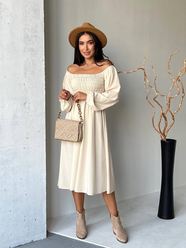 Мод 087 Размер:42-44,46-48,50-52 Тканина:софт Платье, которое будет вам придавать уверенность в себе и в которой вы будете стильно выглядеть.Длина миди.На груди резинка.Мозная одевать со спущенными и с приподнятыми плечами.Супер качество,по супер цене.