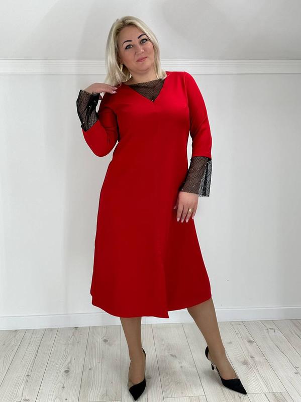 Платье Тканина креп костюмний Цвет черный, красный Размер 48-50, 52-54, 56-58 Красивое нарядное платье трапециевидной формы, с непритачным поясом. На груди и рукавах отделка сеткой. Сзади потайная молния, впереди разрез. Цена: 765 грн