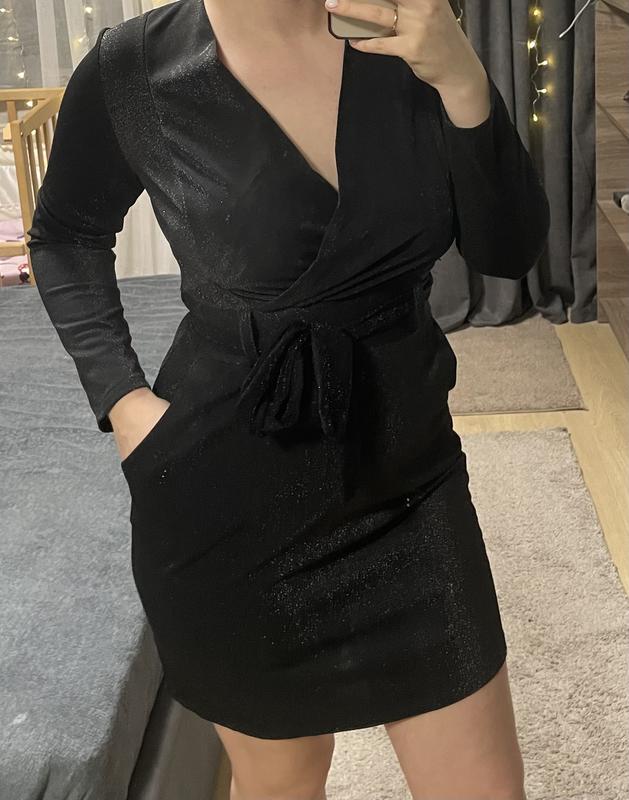 Нарядное платье с блестками, очень красиво сидит по фигуре и подчеркивает талию благодаря пояску.