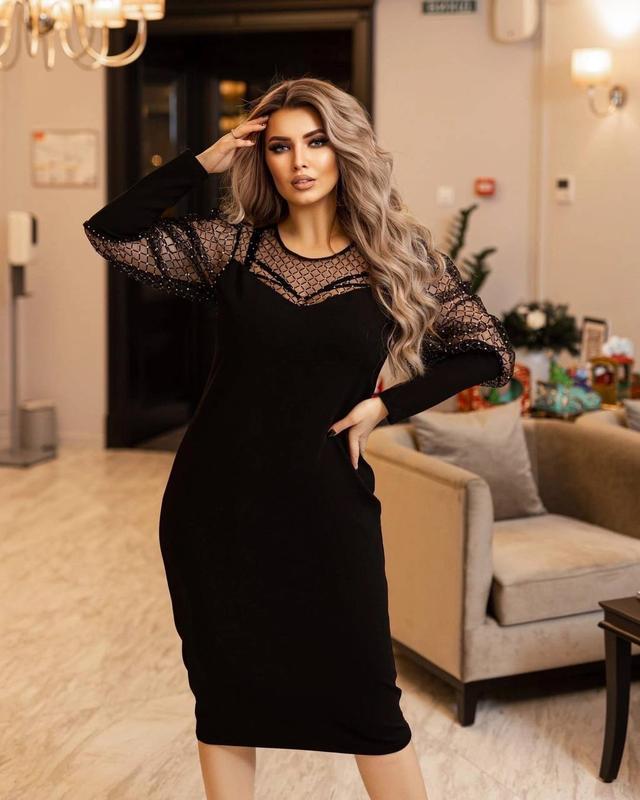 Сукня Модель:264 Ткань: трикотаж + сетка с флоковым рисунком Размеры: 48-50; 52-54 Длина изделия 110 см; Размеры 48-50; ОГ-102; Об-104 Размеры 52-54; ОГ-110; Об-114 Замена сетки на ромбик серебро
