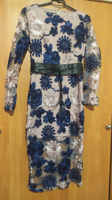 вечернее очень красиво приталенное платье,меет обьемный узор на сетке внизу жидкостей который не просавливает и мое красивую плотную ткань. размер 42-44