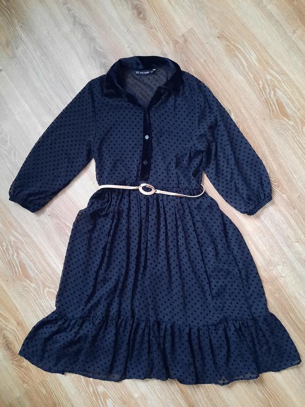 Очень красивое классическое черное платье турецкого производства в горошек, низ на подкладке, вверх сеточкой, пуговицы рабочие, рукава на резиночке. Пояс отдельно 150 грн.