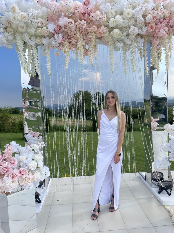Платье из королевского атласа, не просвечивается. Одета один раз, мило подойдет на ваш праздник