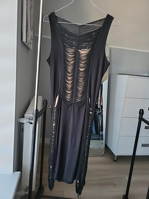 Очень красивое и интересное платье. Состояние очень хорошее. Подойдет на s-m. На спине украшена камушками. (все на месте) Длина изделия 98см. Хорошо тянется.