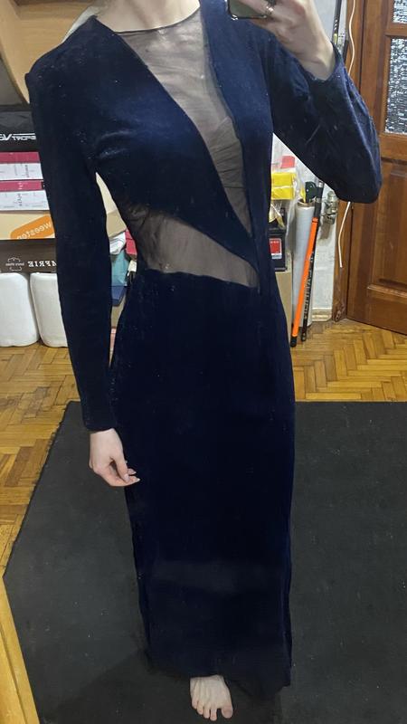 Платье с прозрачными вставками и разрезом сзади.. Цвет: темно синий с блеском.