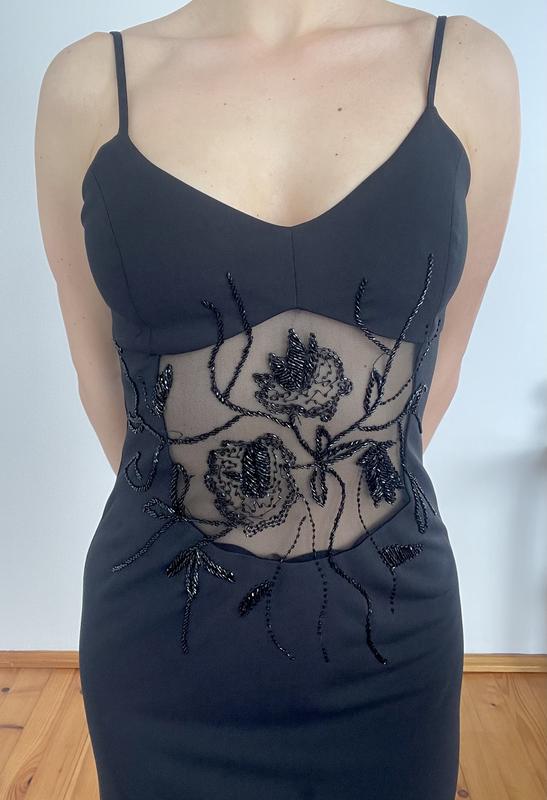 Вечернее/выпускное платье черного цвета. Оригинальная вышивка бисером, внутрь подкладка, красиво тянется. Сзади открытая спинка и распорка. Длина с бретелями 140см