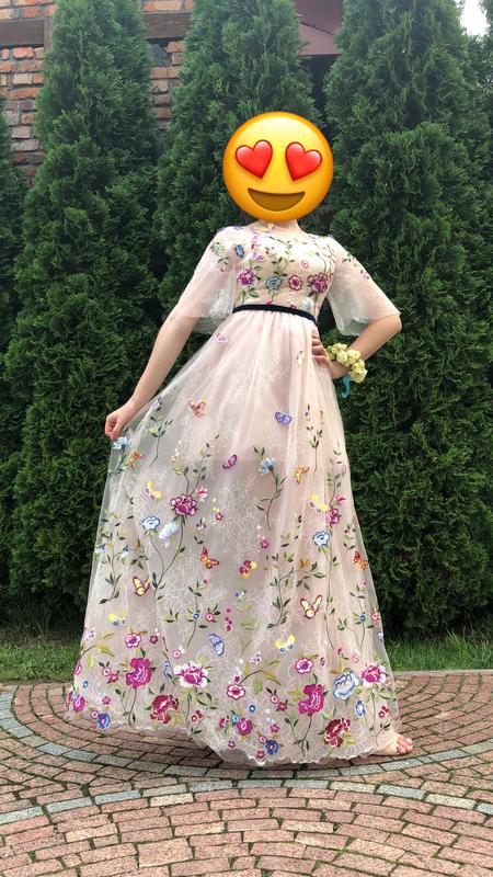 Продам вечірню сукню. Стан 10/10. Колір - ніжно рожевий з вишивкою квітів ручної роботи. Довжина від пояса до низу - 117 см Рукав 30 см Плече 8 см Тулуб 35 см Пояс 30 см