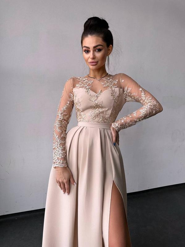 Женское качественное бежевое вечернее длинное элегантное платье в пол с кружевом на выход,...