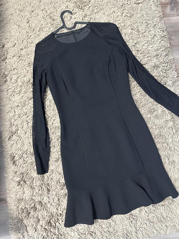 Красивое и качественно пошито, садиться идеально по фигуре, есть подкладка. Материал брючного плана, тянется. Рукав сеточка в горошек. Состояние нового. Размер S.
