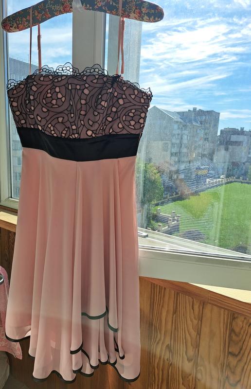 Нарядне плаття пудрового кольору. На грудях чорне мереживо.
