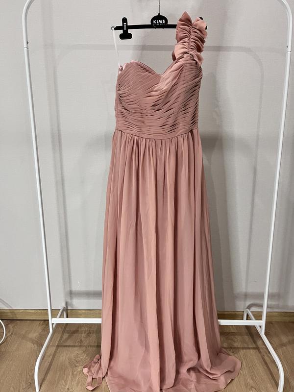 Пудровое платье в пол на одно плечо.по размеру регулируется завязками сзади, поэтому подойдет от М до возможно ХЛ.Очень длинная, на рост 178 была по пятке. Одягалась один раз.
