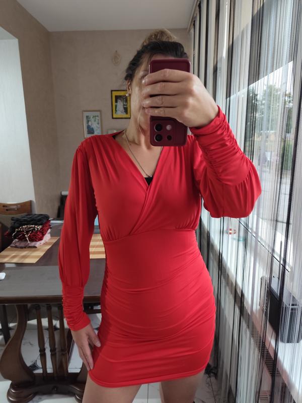 Идеальное состояние, ткань полиэстер и эластен, яркий красный цвет, очень хорошо тянется, классно садится по фигуре,V-образное декольте,, носит плечики,на рукавах и боках складочки, как будто в стяжках, которые по фигуре разравниваются. длина 90см и еще может опускаться на 15 см бежевое до 116 могут хорошо вместиться пог 50 больше