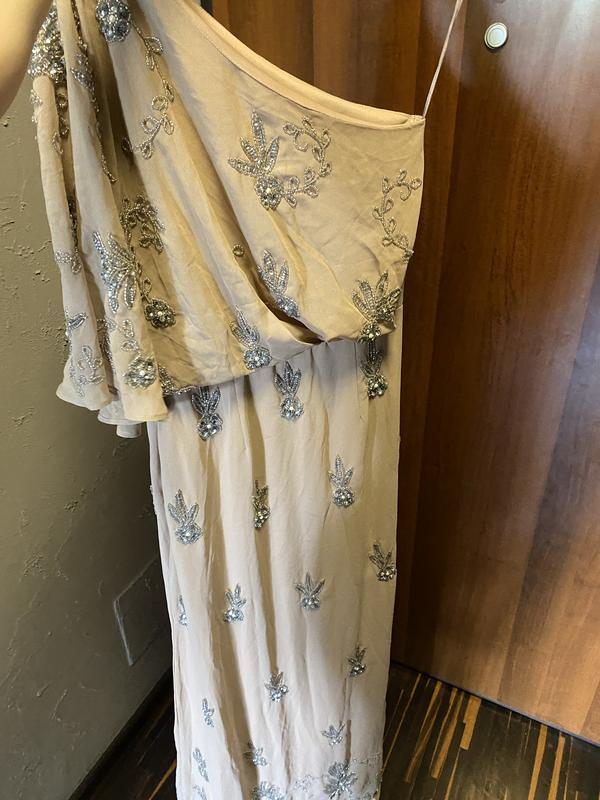 Вечернее платье расшито бисером , одевалось 1 раз , тяжелое , длинное в пол размер Xs-S, на одно плечо идеальное на свадьбу молния под замену ! Молния закрывается , но лучше поменять