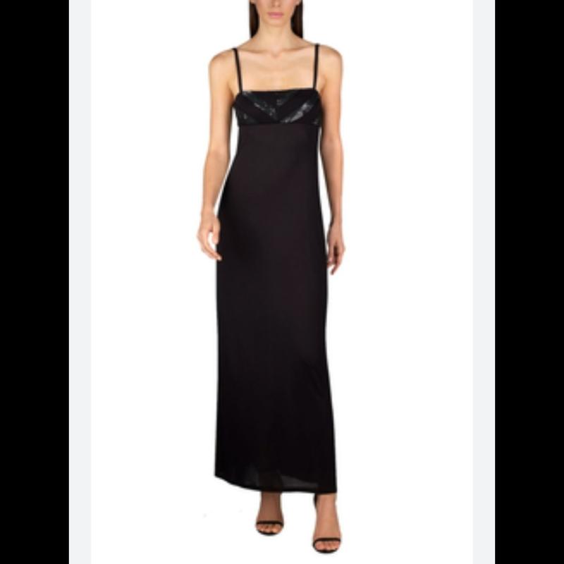 Изысканное вечернее платье макси черного цвета с искусственным шелком (ацетат) бельевом стиле на тоненьких бретелях (не регулируется).На груди,( по атласу) сзади и вдоль разреза вышита бисером.Очень нарядная,стримана и выглядит очень дорого.Меет подкладку тоже из ацетатата.Застегивается сзади на молнию.Красиво подчеркивает все приманки женской фигуры.Прекасно смотрится под туфли на высоком каблуке.Дизайнерская коллекция для Debenhams ( сети популярных английских универмагов).Размер указан М (12,40) английский. Замеры Бретели ( полудлина) 18 см Груди 45 см Талия 38 см Бедра 49 см Глубина разреза сбоку( с одной стороны) 67 см Длина изделия от плеча до низа 144 см Ширина юбки по низу 48 см